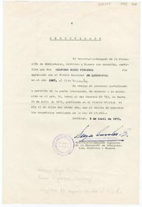Santiago, Chile [a] Salvador Reyes Certificado, 1973 abril 5, [manuscrito] Dirección de Bibliotecas, Archivos y Museos.