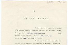 La Dirección de Bibliotecas, Archivos y Museos, certifica que a Salvador Reyes le fue otorgado el Premio Nacional de Literatura el 14 de diciembre de 1967, certificado que emite a petición de Suzanne Bertrand.