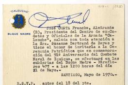 Tarjetas con membretes de : "Liga Marítima de Chile", "El Mercurio", "Instituto Antartico de Chile", "Presidencia del Senado de Chile" y "El Caleuche" Buque Madre.