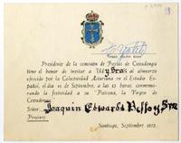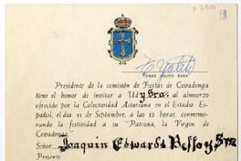 Invitación dirigida a Joaquín Edwards Bello, para asistir a un almuerzo ofrecido por la Colectividad Asturiana, en el Estadio Español, el 11 de septiembre de 1955. Conmemoración de la festividad a su "Patrona, la Vírgen de Covadonga".