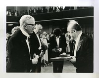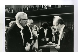 Pablo Neruda, recibiendo la medalla y diploma del Premio Nobel de Literatura en 1971, de manos del Rey Gustaf Adolf de Suecia. Acto realizado ese año en la Iglesia de Filadelfia en Estocolmo.