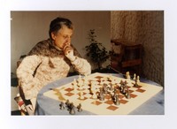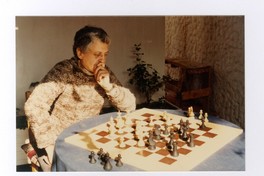 Miguel Arteche jugando ajedrez [fotografía]. Santiago, Chile : [Producción no identificada], 1984. 1 fotografía : Color, 13 x 8,8 cm. .