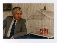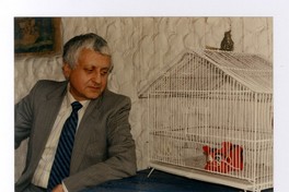 Miguel Arteche y una jaula [fotografía] Santiago, Chile : [Producción no identificada], 1985. 1 fotografía : Color, 12,6 x 8,7 cm. .