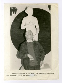 Miguel Arteche junto a la Venus de Medicis [fotografía] / Waldo Yáñez. Los Nichos, Valle de Elqui, Chile : Foto Waldo Yáñez, cerca de 1989. 1 fotografía : Monocromo en blanco y negro, 13 x 8,8 cm. .