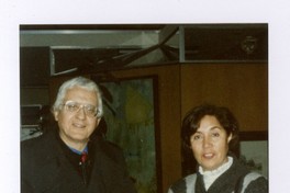 Miguel Arteche junto a otra persona visitando una exposición de arte.