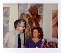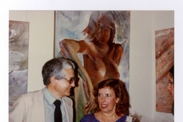 Miguel Arteche en una galería de arte [fotografía]. Santiago, Chile : [Produción no identificada], cerca de 1982. 1 fotografía : Color, 11 x 8,8 cm. .