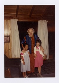 Humberto Díaz-Casanueva junto a sus nietas [fotografía]. Santiago, Chile : [Producción no identificada], Entre 1988 y 1990. 1 fotografía : Color, 8,9 x 12,6 cm. .