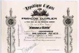 Reconocimiento otorgado a Salvador Reyes con grado de "Comandante" por la Orden Nacional de Honor y Mérito Haitiana, firman el Presidente de la República : Franςois Duvalier y el Secretario de Estado.