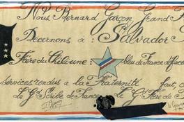 El gran hermano de Francia Bernard Garçon, otorga a Salvador Reyes la "Estrella Azul" de Francia por los servicios otorgados a la Fraternidad, firman el El gran Escribano de Francia T. Bomer y el gran Hermano de Francia Bernard Garçon.
