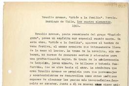 4 reseñas : Braulio Arenas "Adiós a la familia" /Benjamín Rojas Piña, 1961 -- Dos libros de Braulio Arenas / Efraín de la Fuente, 1962 -- "Adiós a la familia" novela de Braulio Arenas / Héctor Burgos Stone, 1962 -- "Adiós a la familia", novela de Braulio Arenas -- Edmundo Herrera, 1962.