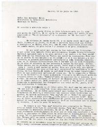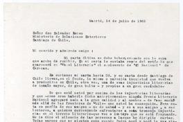 Madrid, España [a] Salvador Reyes, Santiago, Chile Carta, 1966 julio de 14, [manuscrito] / Alberto Baeza Flores. 1 hoja ; 27,5 x 21 cm. .