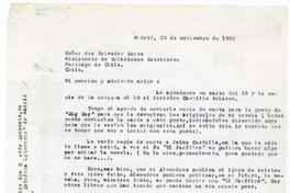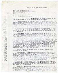 Madrid, España [a] Salvador Reyes, Santiago, Chile Carta, 1966 noviembre 23, [manuscrito] / Alberto Baeza Flores. 1 hoja ; 27,5 x 21 cm. .