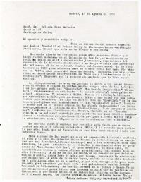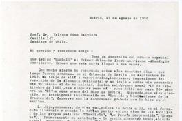 Madrid, España [a] Yolando Pino Saavedra, Santiago, Chile Carta, 1966 agosto 17, [manuscrito] / Alberto Baeza Flores. 1 hoja ; 27,5 x 21 cm. .