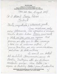 Agradece los libros "Poesía caminante" y "Chile, un país para un regreso" con las bellas dedicatorias. Le comenta que viaja a Alemania, y que le envía un folleto con los datos de dos amigos que trabajan en el Instituto Iberoamericano de Berlín [el folleto mencionado no se encuentra adjunto a la carta].