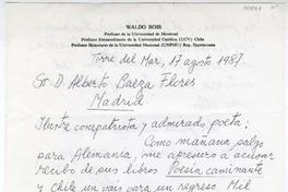 Torre del Mar, España [a] Alberto Baeza Flores, Madrid, España Carta, 1987 agosto 17, [manuscrito] Waldo Ross.