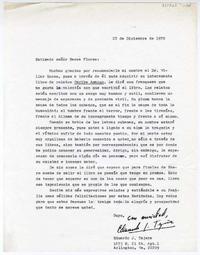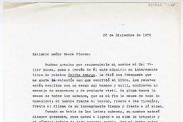 Agradece que recomendará su nombre al Dr. Villar Roces. Le comenta que a través de él, adquirió su libro "Caribe amargo", le agrado el mensaje de protesta y de esperanza de su libro.