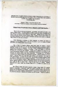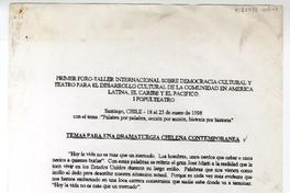 Temas para una dramaturgia chilena contemporánea [manuscrito] / Sergio Guzmán Ortega. 3 hojas ; 21,5 x 32,9 cm. .
