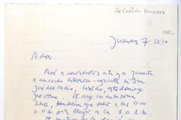 El vergel, Chile [a] Pedro Lastra Carta, 1981, [manuscrito] / Cristián Huneeus. 2 hojas : 25 x 17,5 cm. .
