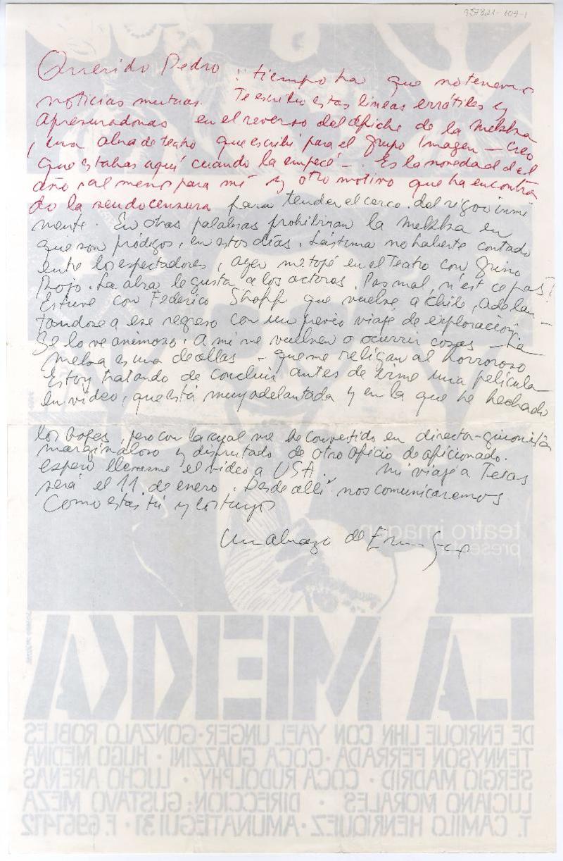 Carta escrita al reverso de un afiche; presentando "La Mekka" por el Teatro Imagen.