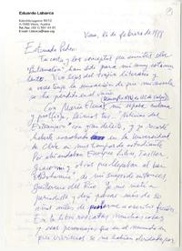 Viena, Austria [a] Pedro Lastra Carta, 26 de febrero 1998, [manuscrito] / Eduardo Labarca Goddard. 1 hoja ; 29 x 21 cm. .
