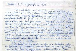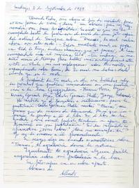 Santiago, Chile [a] Pedro Lastra, Nueva York Carta, 3 de septiembre 1989, [manuscrito] Alberto Rubio.