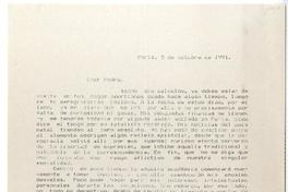 Paris, Francia [a] Pedro Lastra, Nueva York Carta, 5 de octubre 1991, [manuscrito] Waldo Rojas.