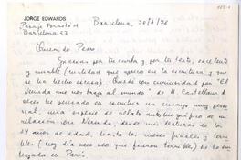 Barcelona, España [a] Pedro Lastra, Nueva York Carta, 30 de junio 1978, [manuscrito] / Jorge Edwards. 1 hoja ; 14,4 x 11,4 cm. .