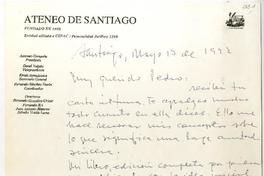 Santiago, Chile [a] Pedro Lastra, New York Carta, 12 de mayo 1992, [manuscrito] Antonio Campaña.