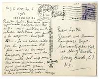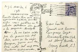 Nueva York [a] Pedro Lastra Tarjeta, 6 de marzo 1981, [manuscrito] Claudio Giaconi.