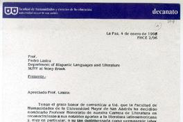 La paz, Bolivia [a] Pedro Lastra Carta, 4 de enero 1996, [manuscrito] Guillermo Mariaca Iturri.