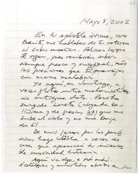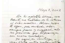 Santiago, Chle [a] Pedro Lastra Carta, 8 de mayo 2002, [manuscrito] Juan Loveluck.