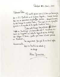 Quilpué, Chile [a] Pedro Lastra Carta, 15 de abril 2002, [manuscrito] / Elvira Hernández (seudónimo). 1 hoja ; 28 x 21,5 cm. .