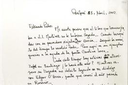 Quilpué, Chile [a] Pedro Lastra Carta, 15 de abril 2002, [manuscrito] Elvira Hernández (seudónimo).