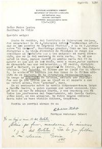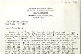 Massachusetts [a] Pedro Lastra, Santiago, Chile Carta, 29 de octubre 1965, [manuscrito] / Enrique Anderson Imbert. 1 hoja ; 24 x 16 cm. .
