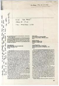 Comunica envío, por intermedio de Nelsón Osorio, de un impreso con una breve reseña sobre un libro suyo y de él, aparecido en revista "Cielo abierto".