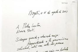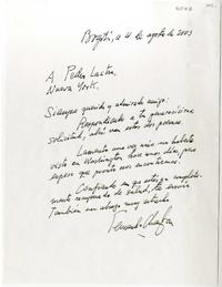 Bogotá, Colombia [a] Pedro Lastra, New York Carta, 4 de agosto 2003, [manuscrito] Fernando Charry Lara.