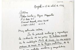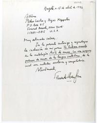 Bogotá, Colombia [a] Pedro Lastra, New York Carta, 15 de abril 1996, [manuscrito] Fernando Charry Lara.