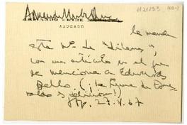 Santiago, Chile [a] Pedro Lastra Tarjeta, 27 de abril 1967, [manuscrito] Armando Uribe Arce.