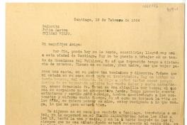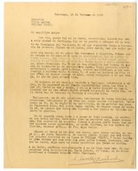 Comenta a Julia Lastra [hermana de Pedro Lastra], que está trabajando en un texto de enseñanza sobre el folklore. Comunica que la esperará en Santiago, todos los días, al mediodía en el Teatro Experimental.