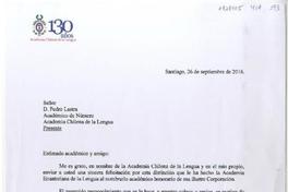 Santiago, Chile [a] Pedro Lastra Carta, 2016 septiembre 26, [manuscrito] Academia Chilena de la Lengua.