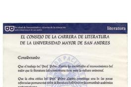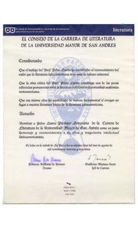 Nombramiento de Pedro Lastra, como "Profesor Honorario de la Carrera de Literatura" de la Universidad Mayor de San Andrés, en reconocimiento a su obra y trayectoria intelectual latinoamericana.