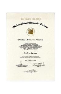 Confiere la distinción académica de "Doctor Honoris Causa" al Doctor Pedro Lastra, concedido por el Consejo Universitario de dicha universidad, por sus méritos académicos y permanente dedicación al estudio del proceso literario peruano.