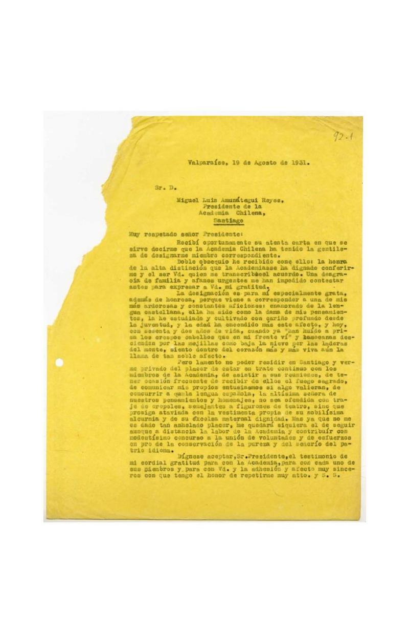 Valparaíso, Chile [a] Miguel Luis Amunátegui Carta, 1931 agosto 19, [manuscrito] Egidio Poblete.
