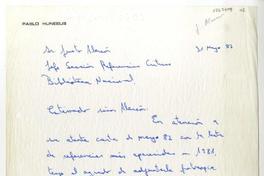 Santiago, Chile [a] Justo Alarcón Carta, 1982 abril 31, [manuscrito] / Pablo Huneeus. 1 hoja ; 21,6 x 27,1 cm .