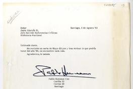 Santiago, Chile [a] Justo Alarcón Carta, 1993 agosto 3, [manuscrito] Pablo Huneeus.