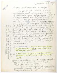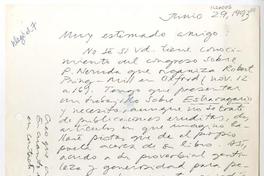 Comenta acerca del Congreso sobre Pablo Neruda, que organiza Robert Pring-Mill en Oxford y solicita dos artículos, para el trabajo sobre Estravagario que presentará.