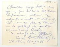 Chillán, Chile [a] Justo Alarcón Tarjeta, 1991 mayo 16, [manuscrito] / Carlos René Ibacache, 1 hoja; 14,5 x 11,8 cm .
