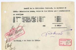 Santiago, Chile [de] Biblioteca Nacional de Chile Recibo, 1940 junio 4, [manuscrito] Luis Durand.