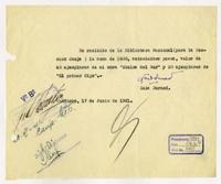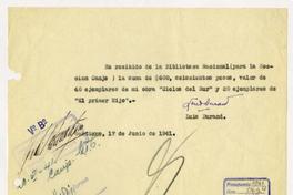 Santiago, Chile [de] Biblioteca Nacional de Chile Recibo, 1941 junio 17, [manuscrito] Luis Durand.