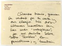 Agradece su carta y también los elogios que dedica a sus últimas novelas: "Temblor" y "Bella y Oscura".